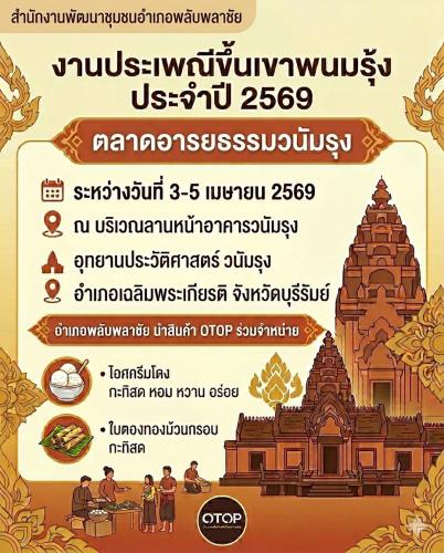 📣 สำนักงานพัฒนาชุมชนอำเภอพลับพลาชัยร่วมจัดแสดงและจำหน่ายสินค้า OTOP ภายในกิจกรรม ตลาดอารยธรรมวนัมรุง ซึ่งเป็นส่วนหนึ่งของงานประเพณีขึ้นเขาพนมรุ้ง ประจำปี ๒๕๖๙ เพื่อส่งเสริมการท่องเที่ยวเชิงวัฒนธรรม และสนับสนุนการสร้างรายได้ให้แก่ชุมชนท้องถิ่น